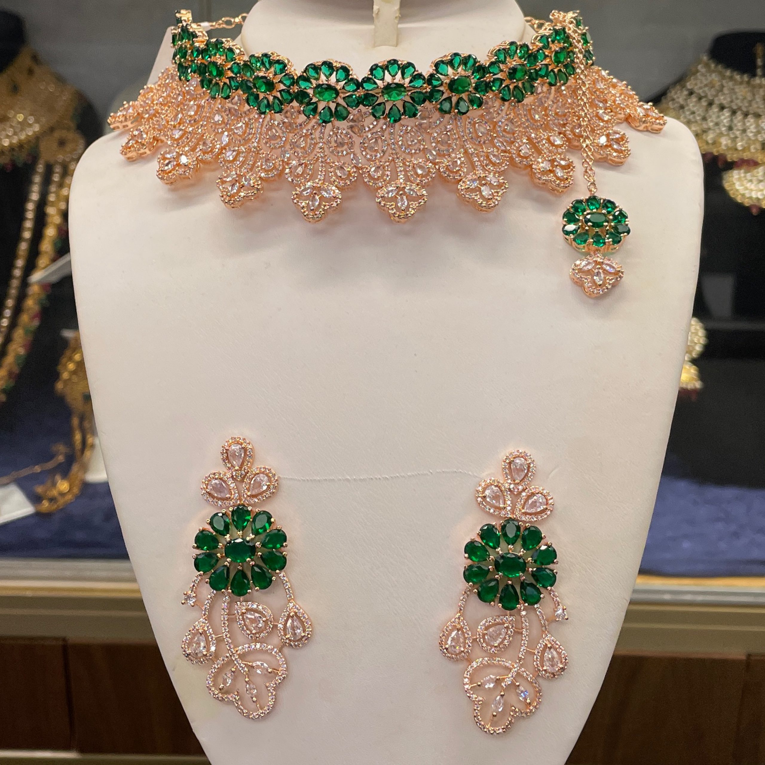 CZ Rose Gold and Emerald stone Necklace, Earrings, and Teekah Set