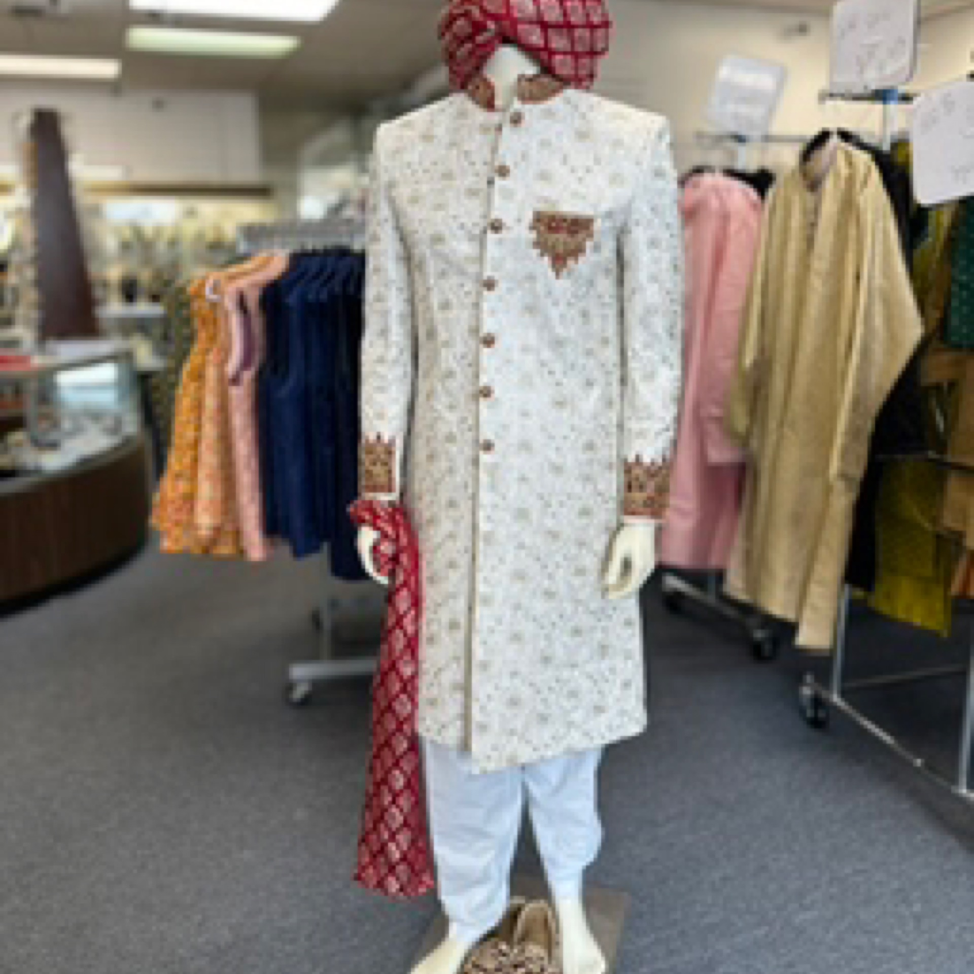 A masterpiece of traditional craftsmanship and modern flair. This stunning white sherwani is adorned with exquisite zardoozi embroidery, showcasing intricate patterns in shimmering gold and silver threads. The vibrant crimson threadwork adds a bold contrast, enhancing the regal allure of the piece. Perfect for weddings, festive celebrations, or any grand occasion, this sherwani seamlessly blends classic elegance with contemporary style. Elevate your ensemble and make a lasting impression in this luxurious, handcrafted attire, shamla and shoes are separate items. This is a complete groom set but on the demand of the customer,we sell separately. Shamla is $60, shoes is $50. Before the sherwani was for $300 but now $225.